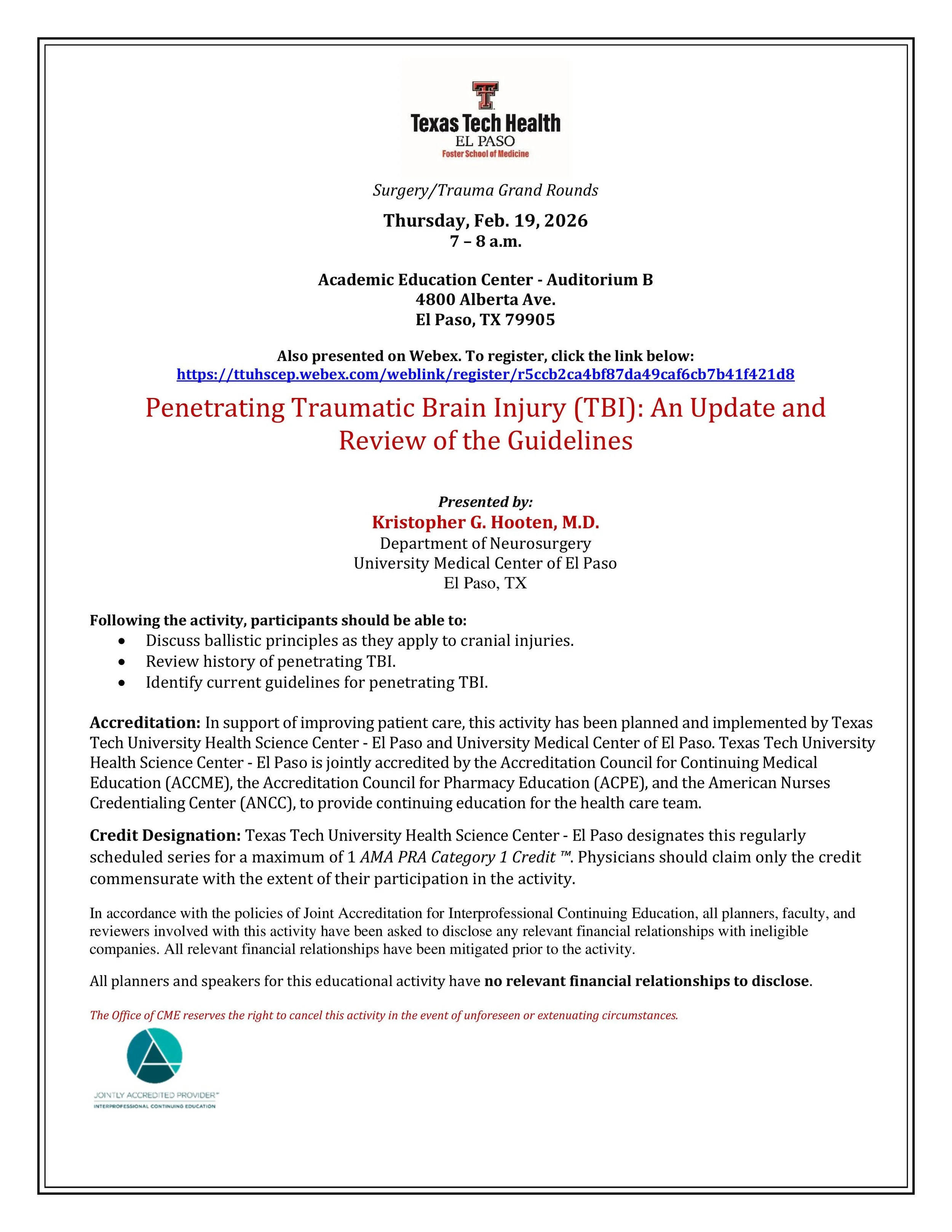 “Penetrating Traumatic Brain Injury (TBI): An Update and Review of the Guidelines,” presented by Kristopher G. Hooten, M.D.