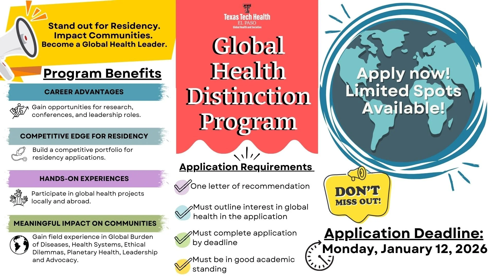 Application Deadline: Global Health Distinction Program Monday, January 12, 2026 8:00 AM 6:00 PM Google Calendar ICS