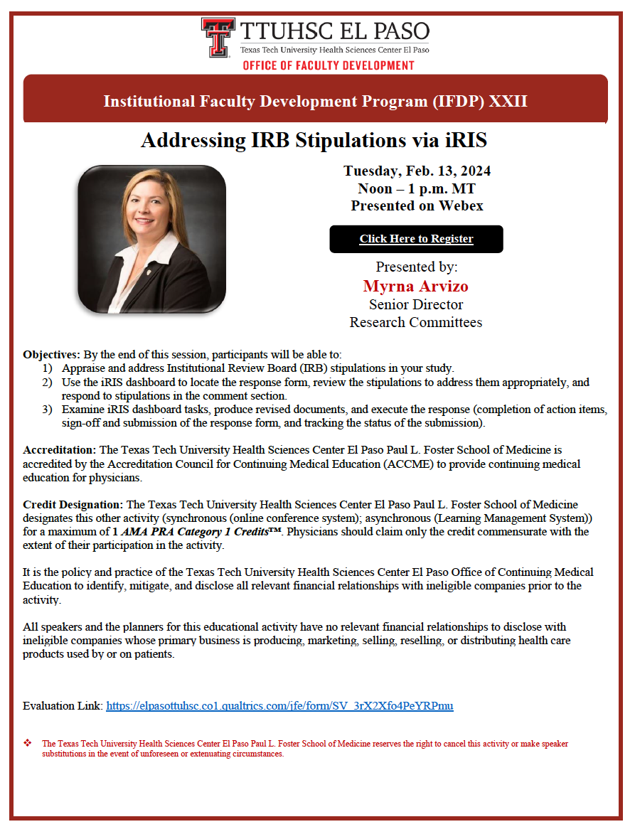 "Addressing IRB Stipulations via iRIS," presented by Myrna Arvizo.