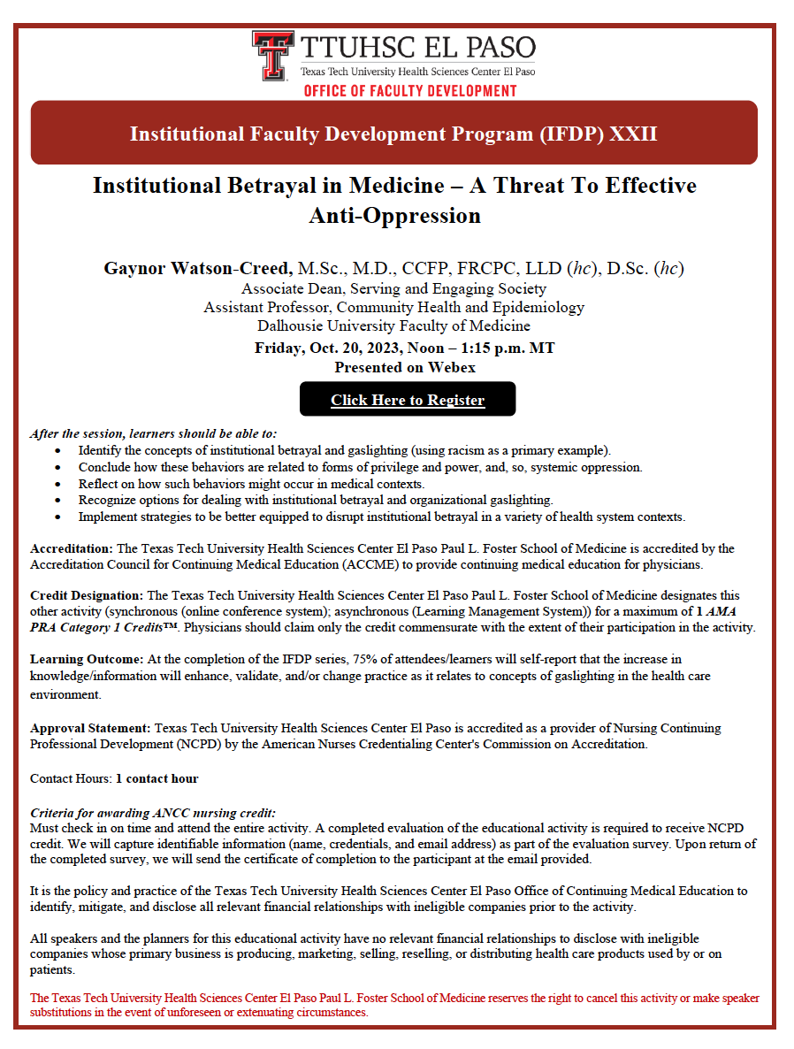 Institutional Faculty Development Program XXII Friday, October 20, 2023 12:00 PM 1:15 PM Google Calendar ICS "Institutional Betrayal in Medicine – A Threat To Effective Anti-Oppression," presented by Gaynor Watson-Creed, M.Sc., M.D., CCFP, FRCPC, LLD (hc), D.Sc. (hc).Presented on Webex. Register here.Download the flyer.