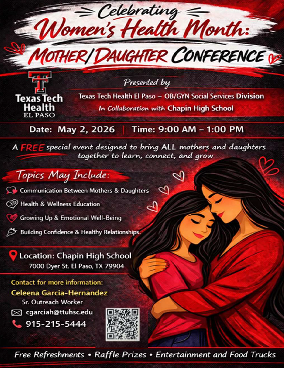 In celebration of Women’s Health Month, Texas Tech Health El Paso’s OB-GYN Social Services Division, in collaboration with EPISD Chapin High School, will host a Mother-Daughter Conference and Community Agency Resource Fair from 9 a.m. to 1 p.m. on Saturday May 2, 2026.