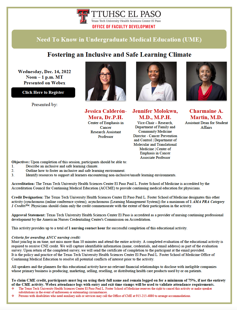 "Fostering an Inclusive and Safe Learning Climate," presented by Jessica Calderón-Mora, Dr.P.H., Jennifer Molokwu, M.D., M.P.H., Charmaine A. Martin, M.D.