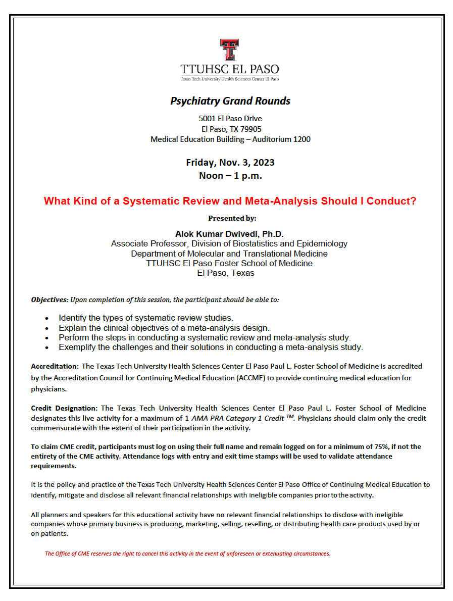 "What Kind of a Systematic Review and Meta-Analysis Should I Conduct?" presented by Alok Kumar Dwivedi, Ph.D.