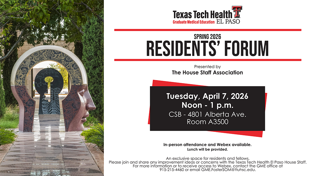 For more information or to receive access to Webex, contact the GME office at 915-215-4460 or email gme.fostersom@ttuhsc.edu.