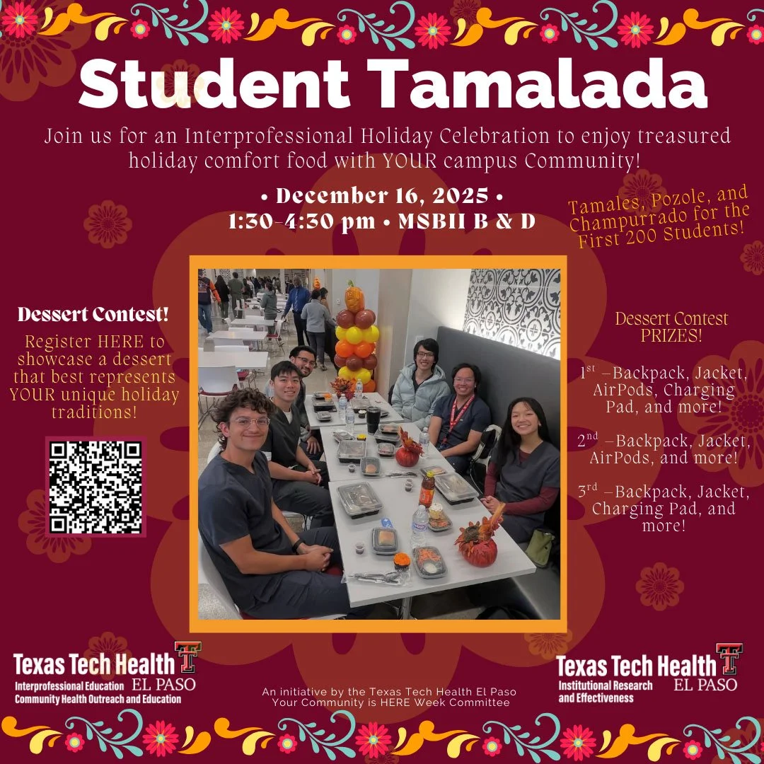 This event is brought to you by the offices of Interprofessional Education and Institutional Research and Effectiveness. It is an initiative of Texas Tech Health El Paso’s Your Community is HERE Week Committee.