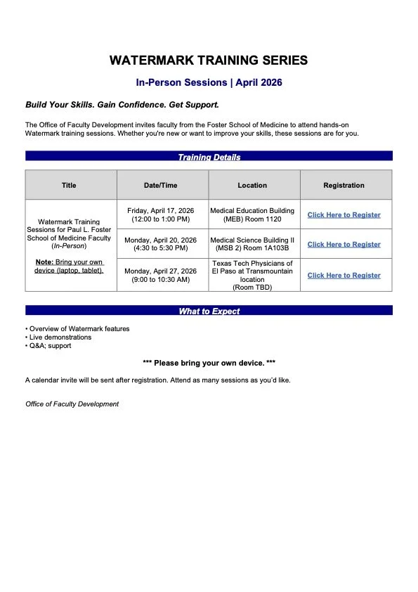 The Office of Faculty Development invites faculty from the Foster School of Medicine to attend hands-on Watermark training sessions. Whether you're new or want to improve your skills, these sessions are for you. Note: Please bring your own device. We look forward to seeing you at these sessions.