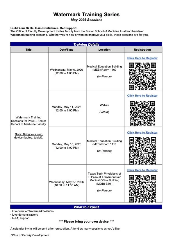 The Office of Faculty Development invites faculty from the Foster School of Medicine to attend hands-on Watermark training sessions. Whether you're new or want to improve your skills, these sessions are for you. Note: Please bring your own device. We look forward to seeing you at these sessions.